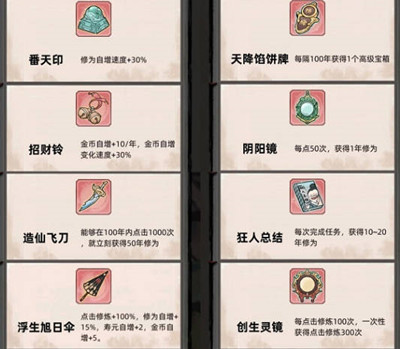 3:如果是需要自研心法的就算了,还有就是免疫天劫的扇子了,再者就是那些给宝箱给钱的,宝箱可以开除几十年修为和商店中全部会卖的东西;