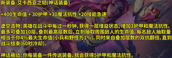 英雄联盟艾卡西亚之韧装备效果一览,英雄联盟游戏中在s13的新赛季的时候会上线几个新的装备,这篇文章就给你们带来艾卡西亚之韧装备的效果,下面跟着小编一起来阿卡哪款呢吧,希望能帮到你。
