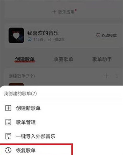 进入创建歌单的菜单页面之后,然后我们点击里面的恢复歌单,接着选择要恢复的歌单即可。